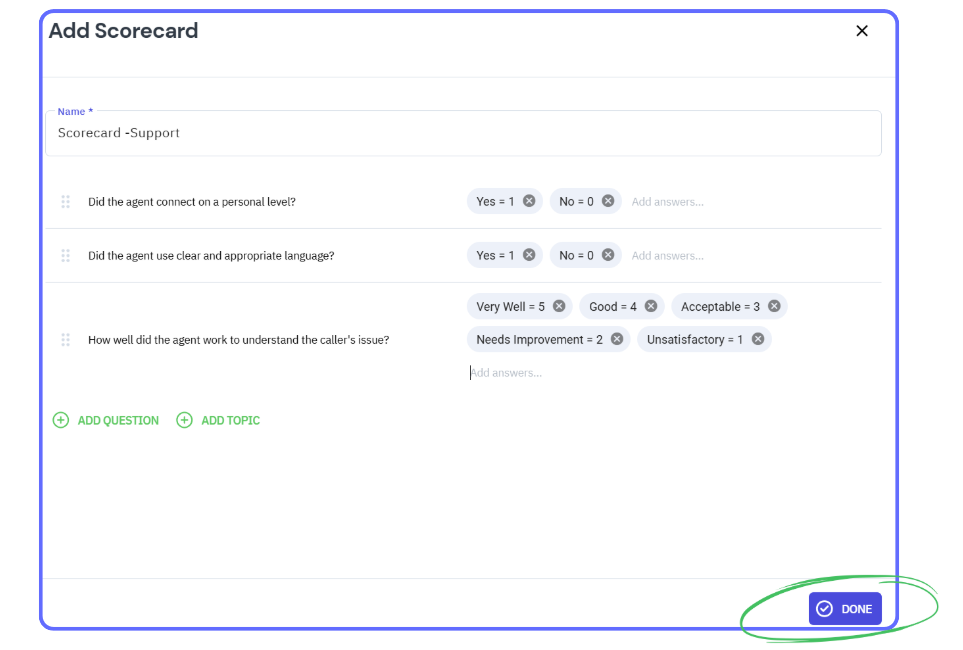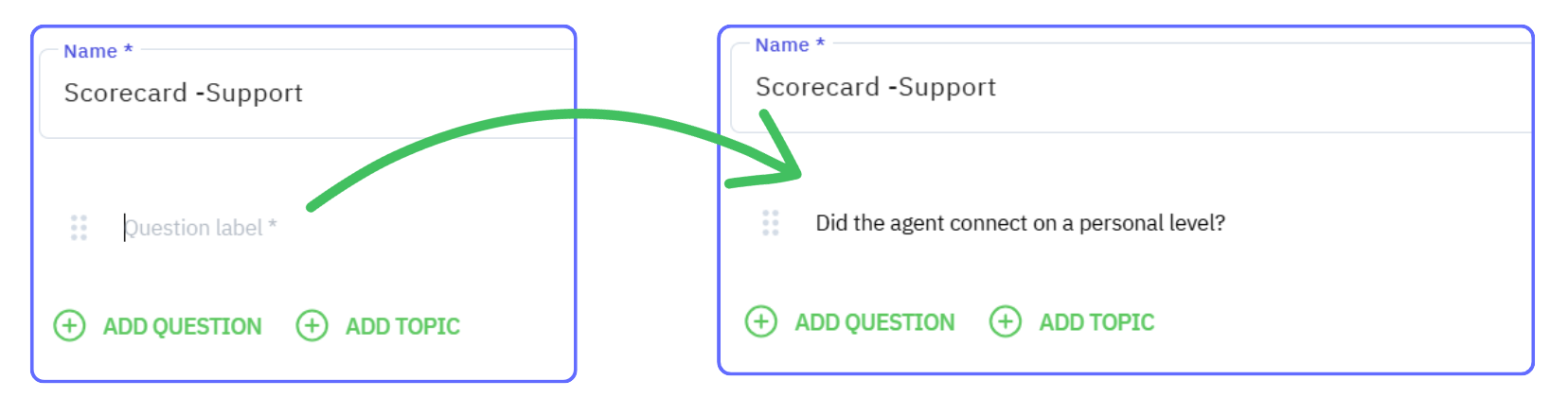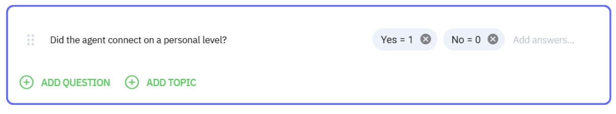 Click Add Question, then type into the Question Label field for each criterion you want to evaluate (e.g., Did the agent connect on a personal level?).
