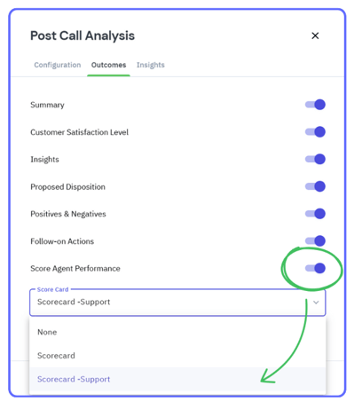 In the Outcomes tab, enable Scorecard and select the scorecard you created.