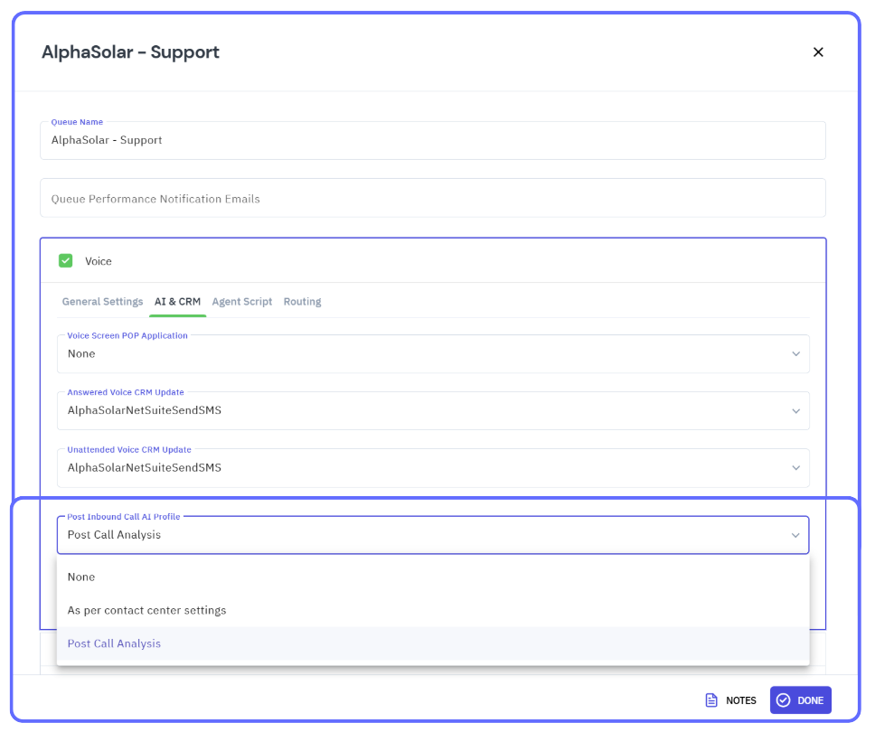 In the queue editor, open Voice → AI & CRM tab and change AI Profile from As per Contact Center settings (default) to your new profile—for both Inbound and Outbound as needed.